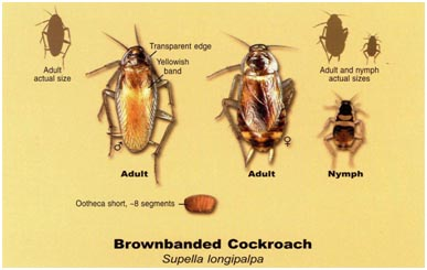 The brown banded cockroach, from the name itself, is characterised by having two distinct bands seen on its nymph and adult body. It can also be distinguished from other species because it lacks the two pronotal stripes. An adult can grow up to 10mm to 15mm long, with males being longer when compared to the females.