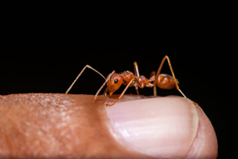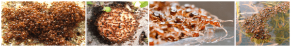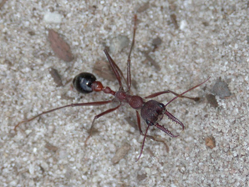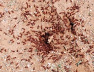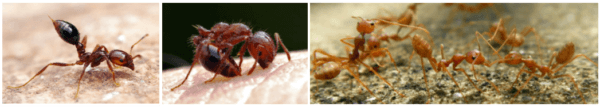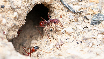 Fire Ants have nests without any clear entrance holes, and larger nests can be identified by a mound of loose soil. When disturbed, the ants quickly rush out of their nest. Foragers come in varying sizes.