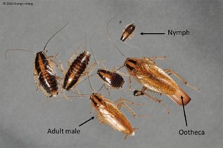 The German cockroach is the most famous of all infesting cockroaches because it is very hard to exterminate. It is characterised by its light to medium brown colour with two parallel bands on its body. It is smaller than the other cockroach species with a length of only 10 to 15 mm. The males are thinner with a tapered posterior abdomen while the females are thicker with a rounded posterior abdomen.
